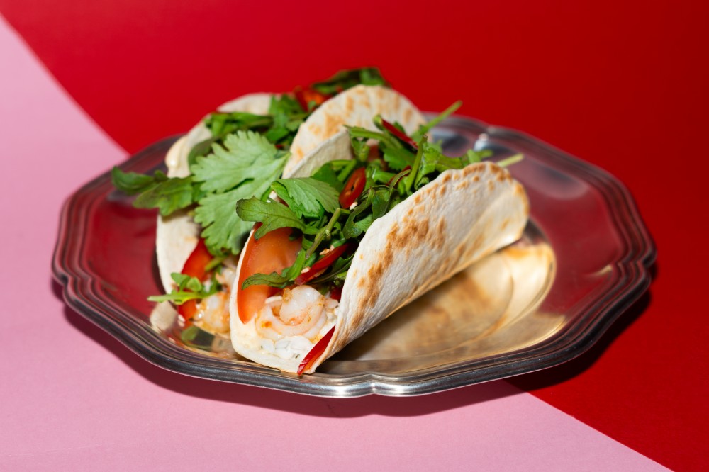 Соковита креветка, обсмажена в соусі sweet chili, соус тар-тар, болгарський перець, рукола, томати.+ додаємо гуакомоле та сальсу з томатів.Порція: 2 шт.
