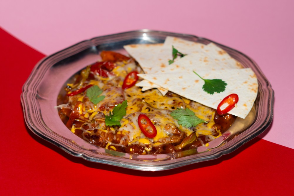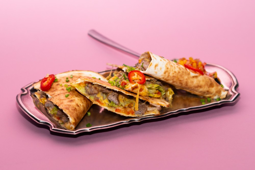 Кесаділья — тепла тортилья з сиром та начинкою на вибір, запечена до золотистої скоринки.Телятина в мексиканському соусі, мікс сирів, болгарський перець, кукурудза.