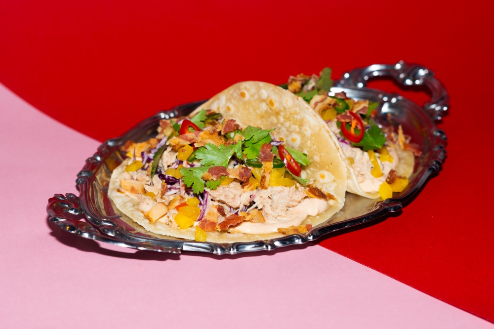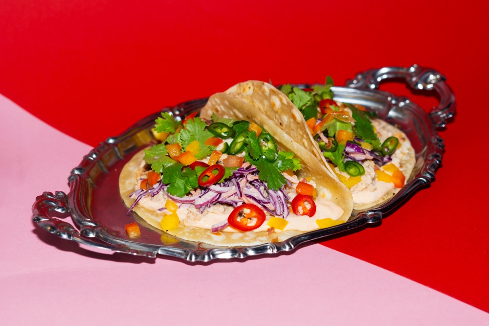 Тортілья власного виробництва, ніжна тушкована телятина в соусі Блек печер, соус майочілі та сирний, салат коул слоу, перець болгарський, кінза, перець чілі.+ додаємо гуакомоле та сальсу з томатів.Порція: 2 шт.