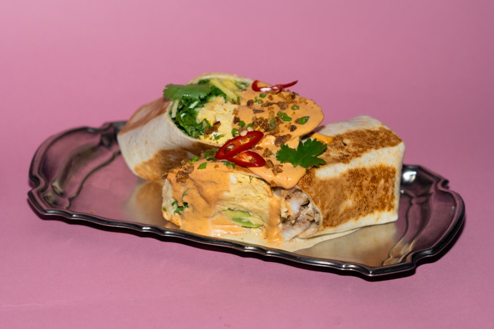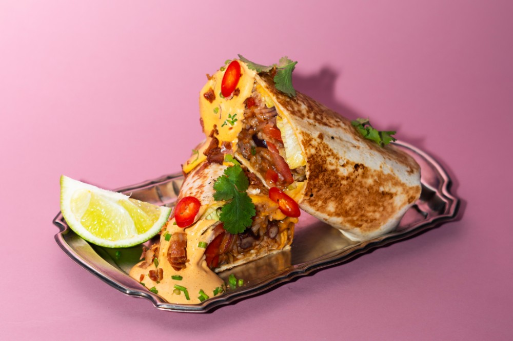Тортілья власного виробництва, курка у мексиканських спеціях, соус майочілі, сирний соус,салат коул слоу, перець болгарський, кінза, чилі, бекон.+ додаємо гуакомоле та сальсу з томатів.Порція: 2 шт.